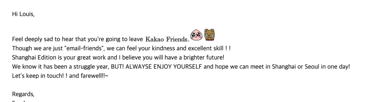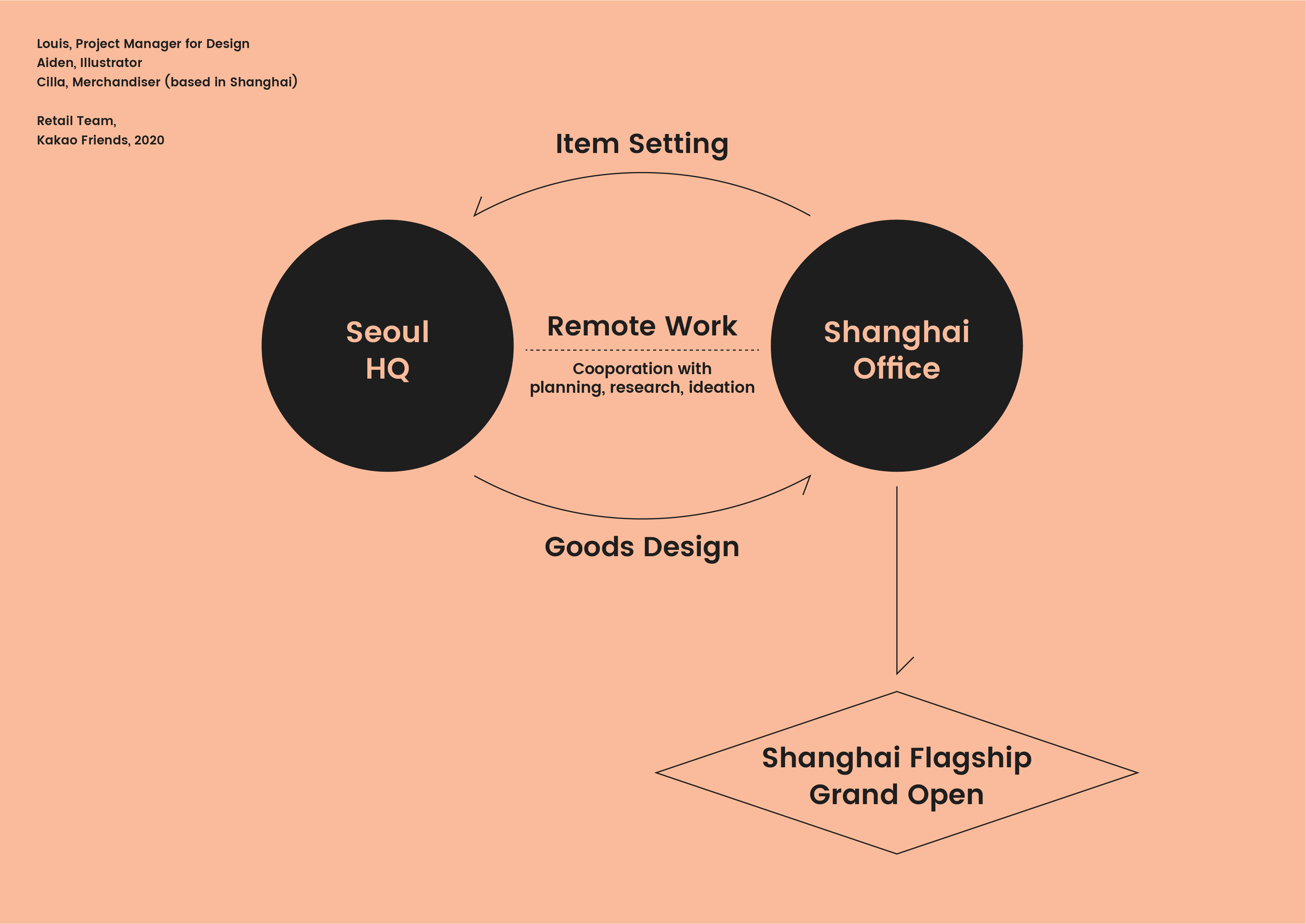 중국 내 첫 번째 상하이 플래그십 스토어 IP 상품을 만들기 위해 중국 현지 지사와 직접 소통하고 다양한 디자인 기획을 제안했습니다. 성공적인 반응과 판매를 이끌었던 'Friends in Jeju'처럼 직관적이고 친근한 접근법으로, 결과적으로 첫 번째 테마는 상하이의 주요 랜드마크에 방문한 카카오프렌즈 중심의 스토리라인으로 확정하였습니다.